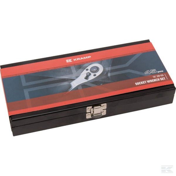 | - Socket wrenches 1/4": 4, 4,5, 5, 5,5, 6, 7, 8, 9, 10, 11, 12, 13 - Socket wrenches 1/2": 13, 14, 15, 16, 17, 18, 19, 21, 22, 24, 27, 30, 32 - Extended socket wrenches 1/2": 10, 13, 17, 19 - Socket wrenches for plugs 1/2": 16, 21 - Articulated wrenches: 8, 10, 11, 12, 13, 14, 17, 19, 22 - Hex sockets: 3, 4, 5, 6 - Flat screwdriver sockets: 4, 5,5, 7 - Phillips screwdriver sockets Ph: 1, 2, 3 - Torx sockets with hole 1/4": T8, T10, T15, T20, T25, T27, T30, T40 - Torx sockets 1/4": E4, E5, E6, E7, E8, E10, E11 - Torx sockets 1/2": E12, E14, E16, E18, E20, E24 - Spinner handles 1/4" and 1/2" - Screwdriver socket 1/4" - Cardan joint 1/4" and 1/2" - Extension 1/2" 250 mm and 125 mm - Extension 1/4" 50 mm - 1/2" to 3/8" socket adapter with a hole - Metal case |