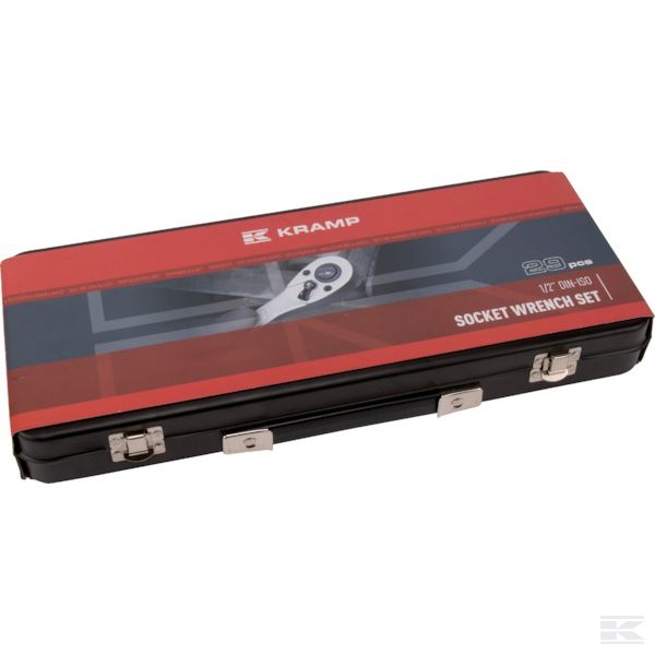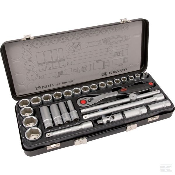 Profesionāls 29 gab. mciņu komplekts. 1/2" atslēga, ar smalko zobratu reverso sprūdratu un dažādām muciņām no hroma vanādija tērauda. Labi sakārtotā, izturīgā metāla korpusā perfektai instrumentu aizsardzībai.