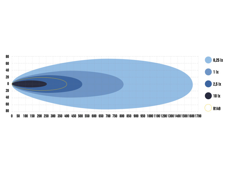 • Maksimāla gaismas jauda un attālums – līdz 816 metriem (1 lux)