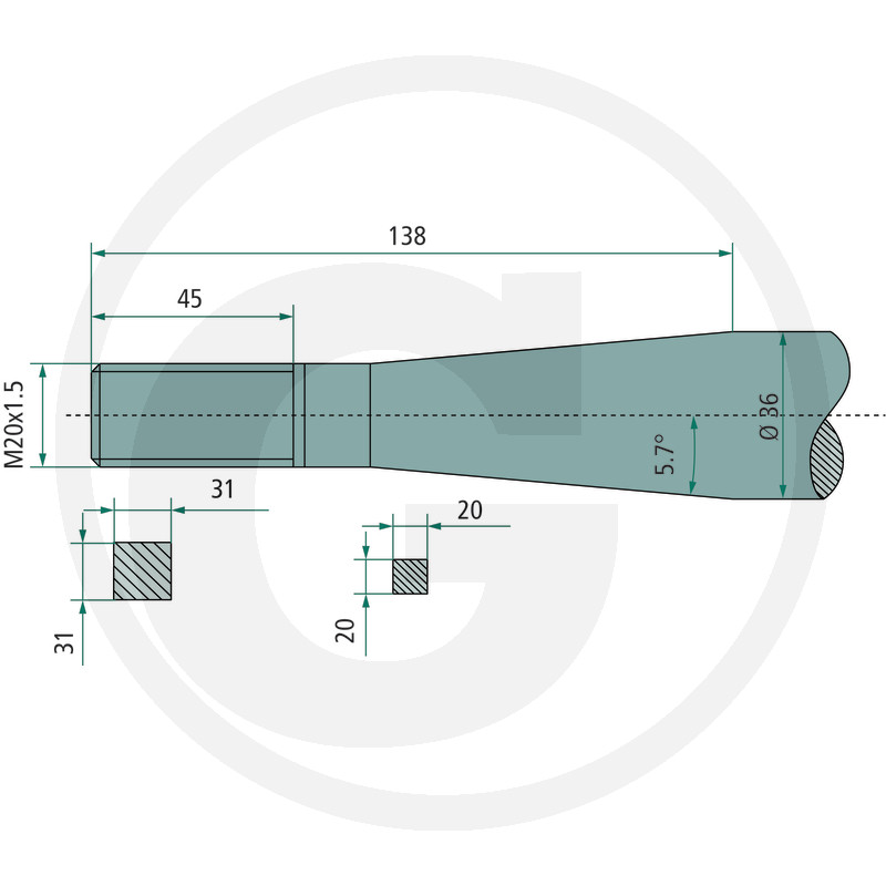 Izliekts pīķis, M20 x 1,5 mm, kvadrātveida, konuss K005