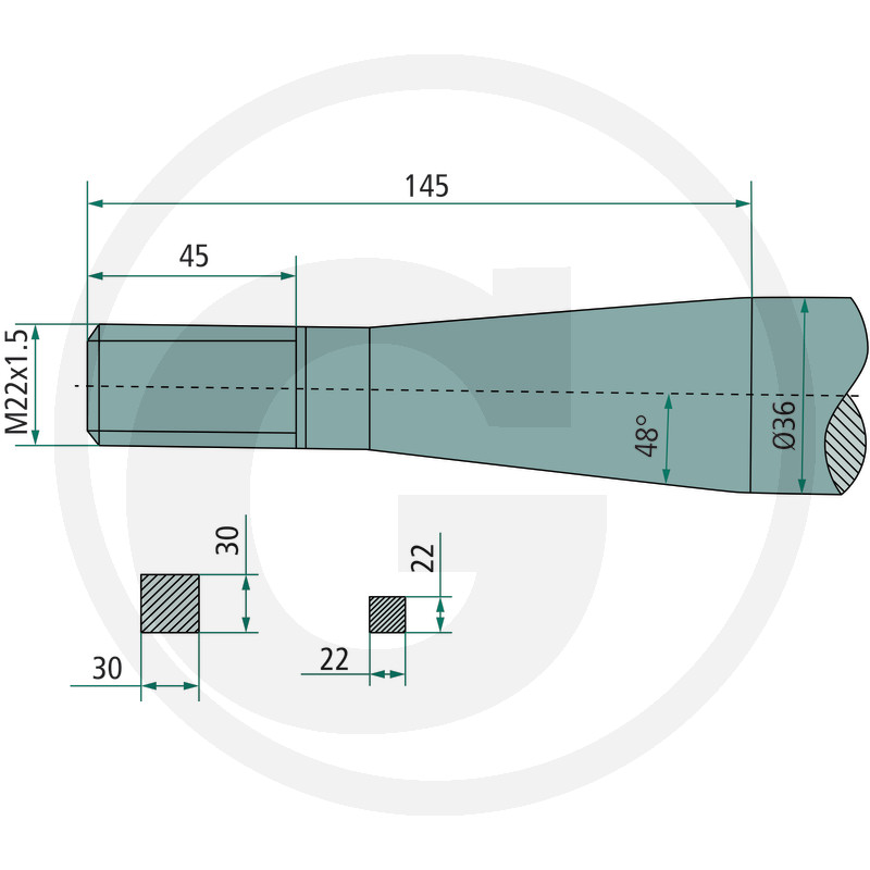 Izliekts pīķis, M22 x 1,5 mm, kvadrātveida, konuss K003
