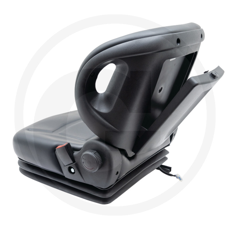 PVC apdare nodrošina izturību pret nodilumu, eļļām un mitrumu, savukārt garenvirziena un atzveltnes slīpuma regulācija ļauj pielāgot sēdvietu operatora vajadzībām.